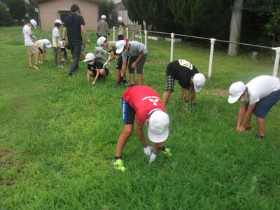 中央小の校庭や中庭、ケヤキ並木、外周などの伸びた草や落ち葉、ごみを全校児童で、一生懸命に拾いました。