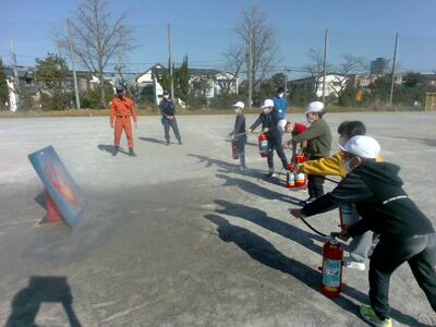 また、避難訓練後は4年生は水消火器の体験をしました。